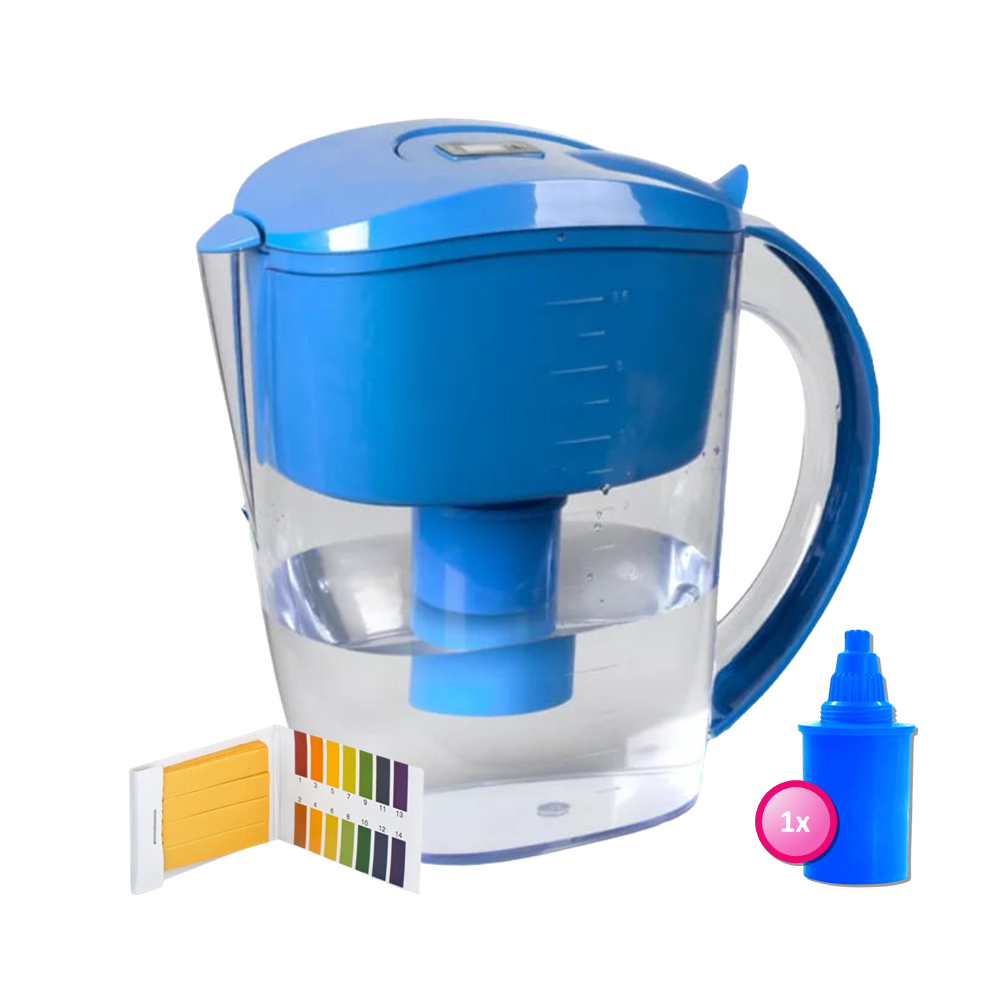 De AlkaKan (blauw) voor alkalisch/ basisch water | met GRATIS pH-testpapier. Een must have voor thuis, op werk en ideaal om mee te nemen op reis. Deze Water Kan is anders dan de standaard waterfilter kannen, zoals Brita, Bobble. Deze waterkan filtert uiteraard het kraanwater op smaak- en geurverstorende elementen/ stoffen en reduceert metalen zoals lood en koper.